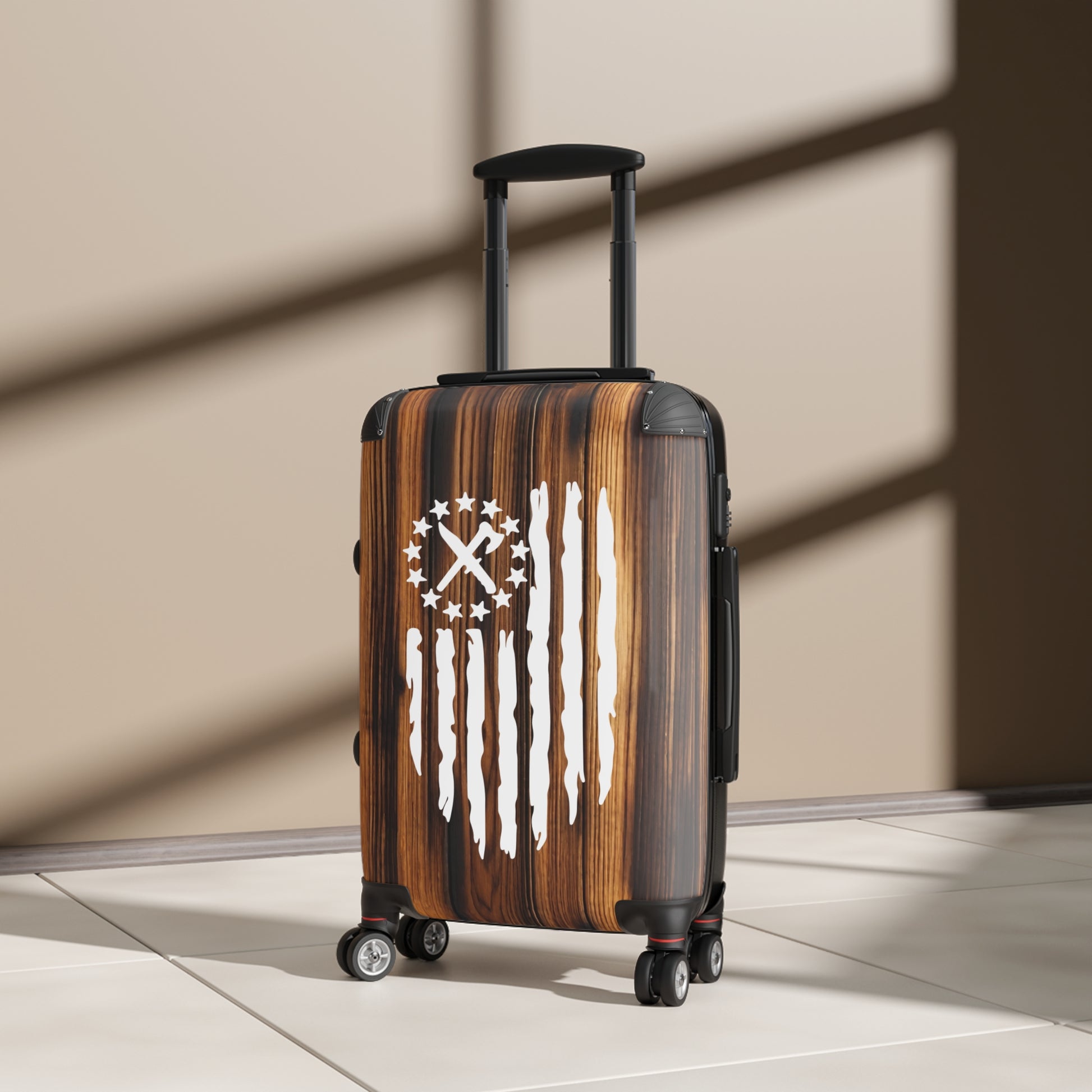 Embark on your next journey with the rugged elegance of our Wood Print and American Flag Suitcase, featuring a bold crossed axe and knife design. This travel companion combines functionality with a patriotic flair, ensuring that you stand out in any crowd, from bustling airports to vibrant city streets.