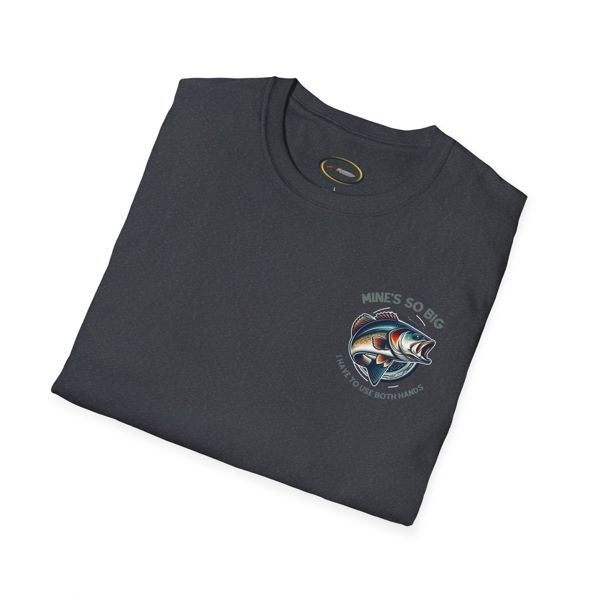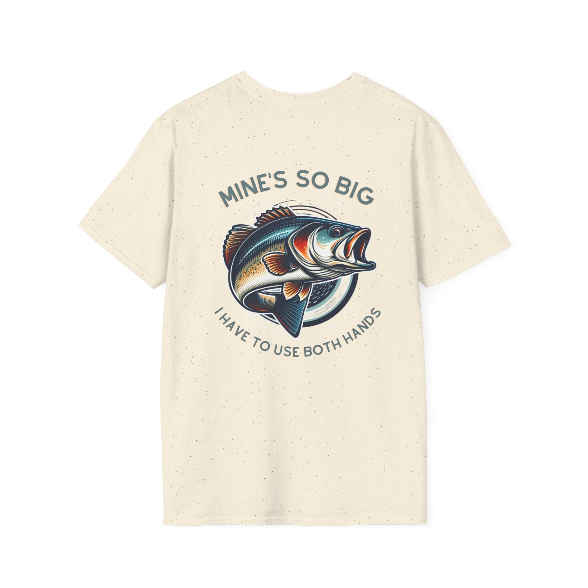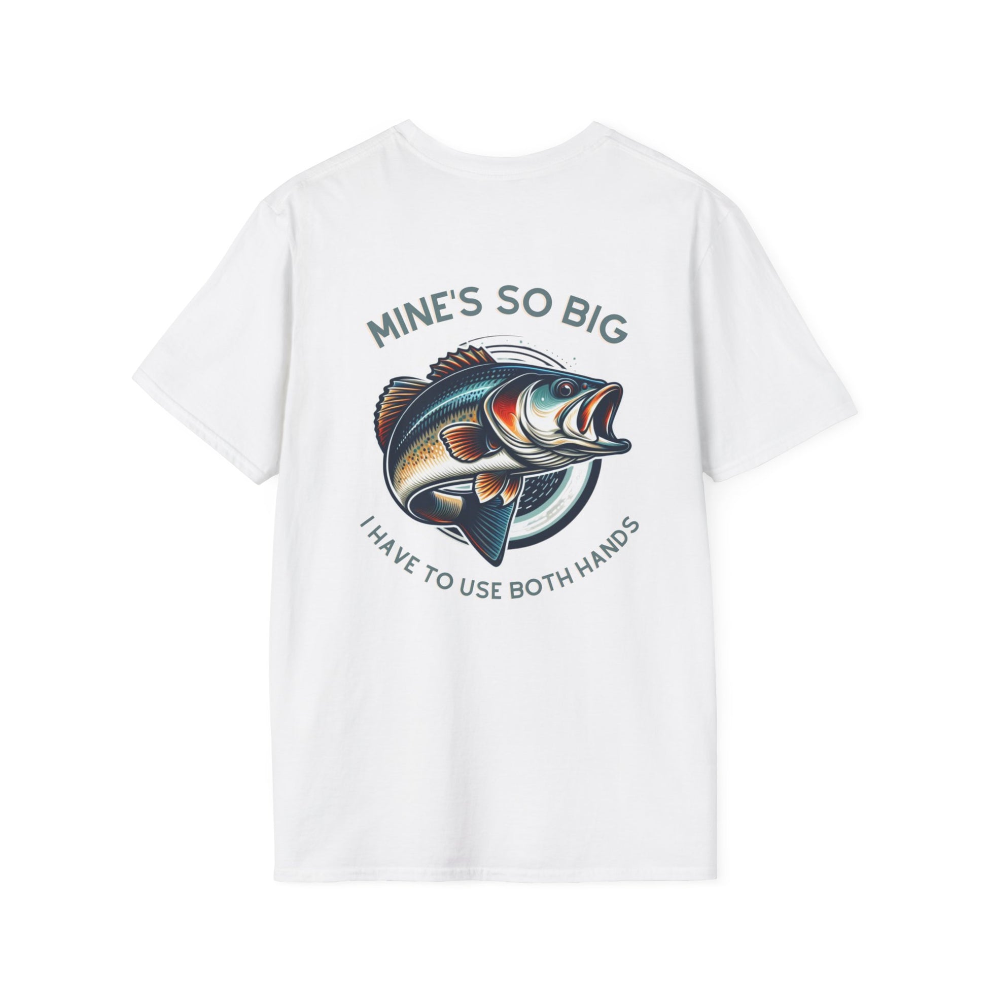 - Humorous Design: Featuring the playful phrase, “Mine’s so big I have to use both hands,” this t-shirt is sure to hook smiles and spark conversations among fellow anglers and friends.
